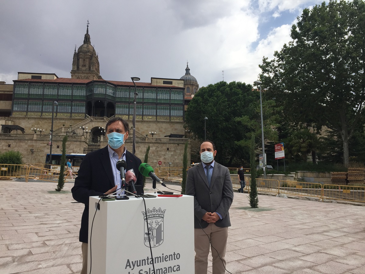 El alcalde de Salamanca, Carlos García Carbayo, ha visitado hoy las obras de urbanización que el Ayuntamiento está llevando a cabo en la Plaza del Mercado Viejo para adecuarla como punto de recepción de turistas, donde puedan parar los autobuses con viajeros que llegan a la ciudad, para permitir que éstos desciendan del autobús, evitando así el estacionamiento de los mismos en el Paseo del Rector Esperabé y debiendo retornar a la plaza para recogerlos.