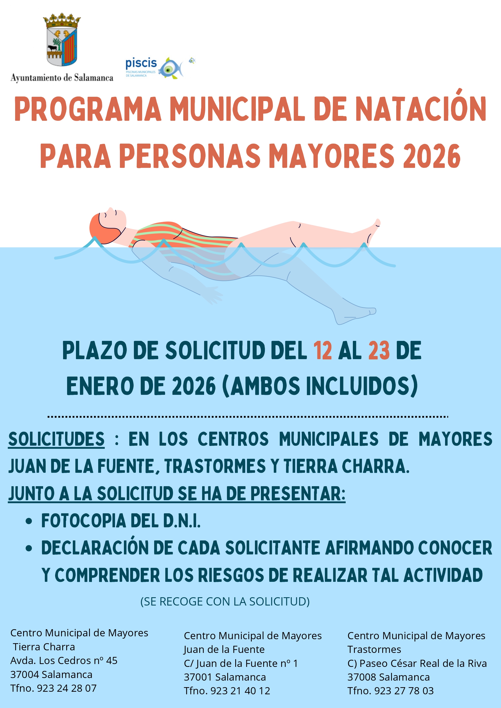 El Ayuntamiento de Salamanca mantendrá abierto del 12 al 23 de enero el plazo de inscripción del Programa Municipal de Natación para Personas Mayores 2026 que se desarrollará en cuatro modalidades: iniciación, perfeccionamiento, natación libre y natación terapéutica. Se llevará a cabo del 1 de marzo al 30 de junio en las piscinas municipales.