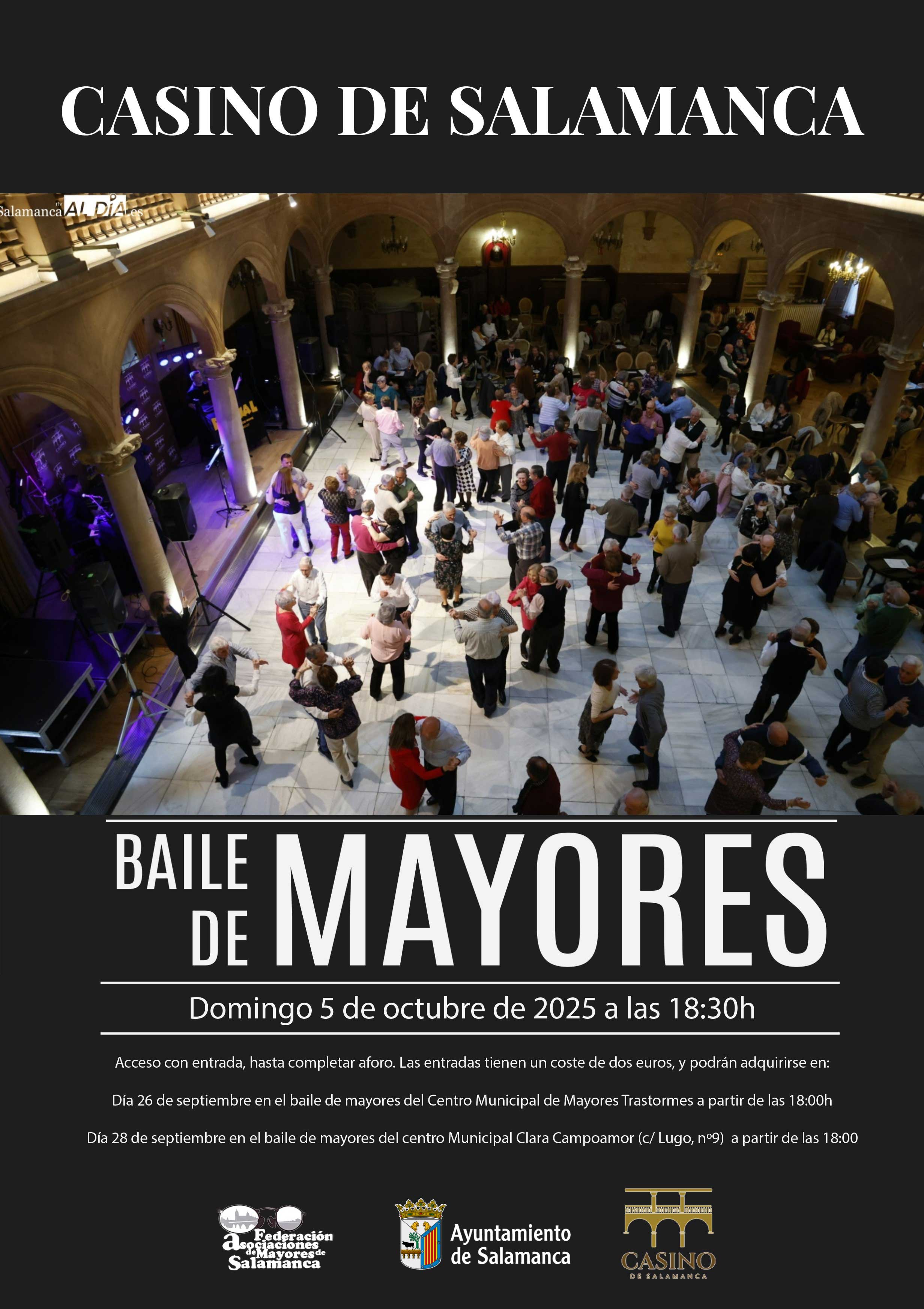 El Ayuntamiento de Salamanca y la Federación de Asociaciones de Mayores de Salamanca (FAMASA) organizan el domingo, 5 de octubre, una nueva sesión de baile de mayores en el Casino de Salamanca, institución cultural que colabora poniendo a disposición sus recursos técnicos y humanos. El objetivo de esta actividad es fomentar la socialización en nuevos espacios de la ciudad dentro del compromiso municipal con la promoción del envejecimiento activo y el abordaje de la soledad no deseada.