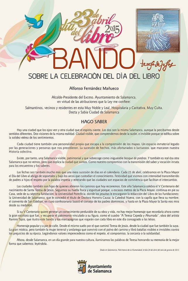 En su bando sobre la celebración del Día del Libro, el alcalde de Salamanca escribe que “las ciudades también son hijas de quienes abrieron los caminos que hoy recorremos”. Al respecto, recuerda que este año en Salamanca celebramos el V Centenario del nacimiento de Santa Teresa de Jesús. “Seguimos su huella física y espiritual” porque, a escasos metros de la Plaza Mayor, continua en pie su Casa, sede de su séptima fundación; la Universidad Pontificia, donde los jesuitas le encargaron la redacción del Libro de las Fundaciones; la Universidad de Salamanca, que le concedió el título de Doctora Honoris Causa; la Catedral Nueva, con la capilla que lleva su nombre; el convento de San Esteban, en cuyo confesionario buscó el consejo de los padres dominicos, y también en la Plaza Mayor, “donde la Santa nos mira desde su medallón”.