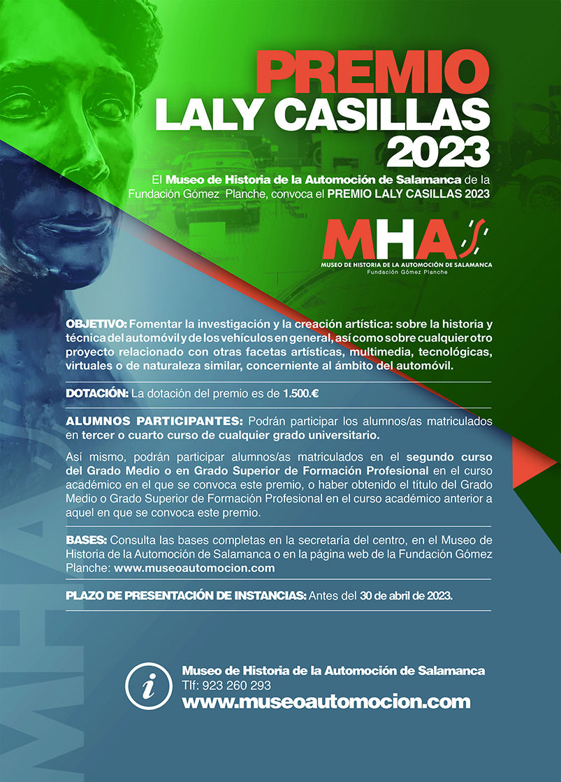 El Museo de Historia de la Automoción de Salamanca (MHAS) de la Fundación Gómez Planche convoca por primera vez el Premio Laly Casillas para el año 2023, recogiendo algunas novedades sobre las anteriores ediciones de su beca. El objetivo de esta convocatoria, conforme se recoge en los estatutos de esta Fundación, pretende fomentar la investigación y la creación artística sobre la historia y técnica del automóvil y de los vehículos en general. El premio es de carácter bianual y su cuantía es de 1.500 euros.