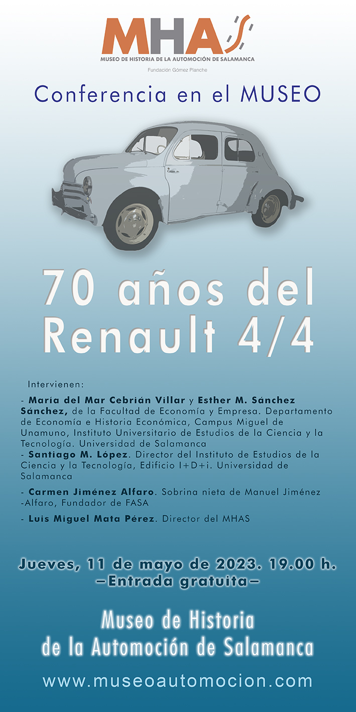 El Museo de Historia de la Automoción de Salamanca (MHAS) organiza este jueves 11 de mayo, a las 19:00 horas, en su sala de conferencias, una mesa redonda compuesta por cuatro figuras del ámbito universitario, expertas en la historia de Fabricación de Automóviles, Sociedad Anónima (FASA) y su icono: el Renault 4CV (4/4), que este año cumple su 70 aniversario.