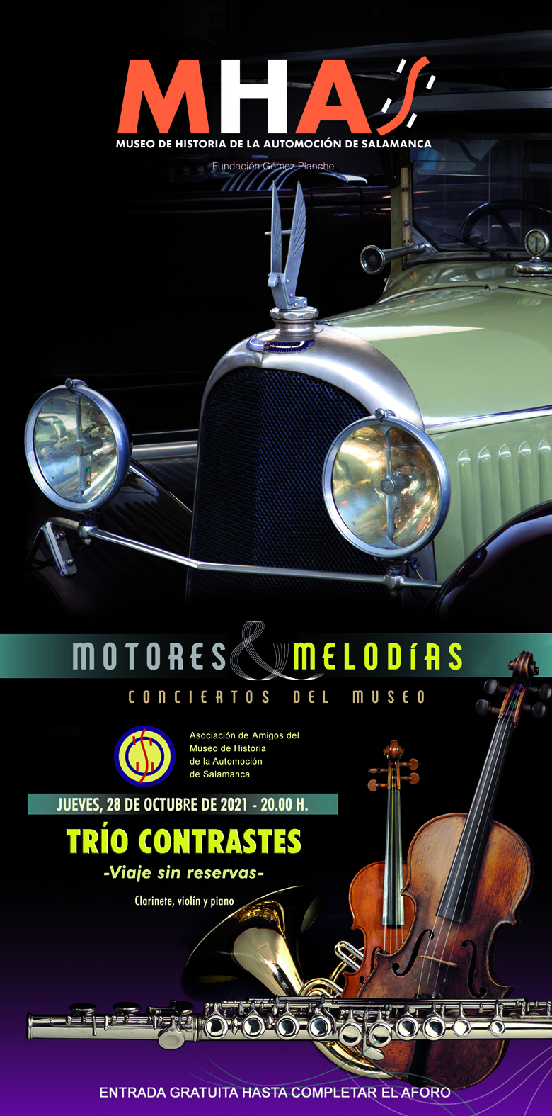 El próximo jueves, 28 de octubre, a las 20:00 horas en la Sala de Exposiciones Temporales, tendrá lugar una nueva sesión del ciclo ‘Motores y Melodías’, con acceso gratuito para todo el público hasta completar el aforo. En esta ocasión, el evento consistirá en un recital a cargo del Trío Contrastes, con Marco Pastor al violín, Lara Díaz al clarinete y Juan Francisco Vicente al piano. Los asistentes podrán disfrutar de obras de autores del siglo XX y XXI, como muestra del compromiso con la música de nuestro tiempo y muy especialmente con la música española.