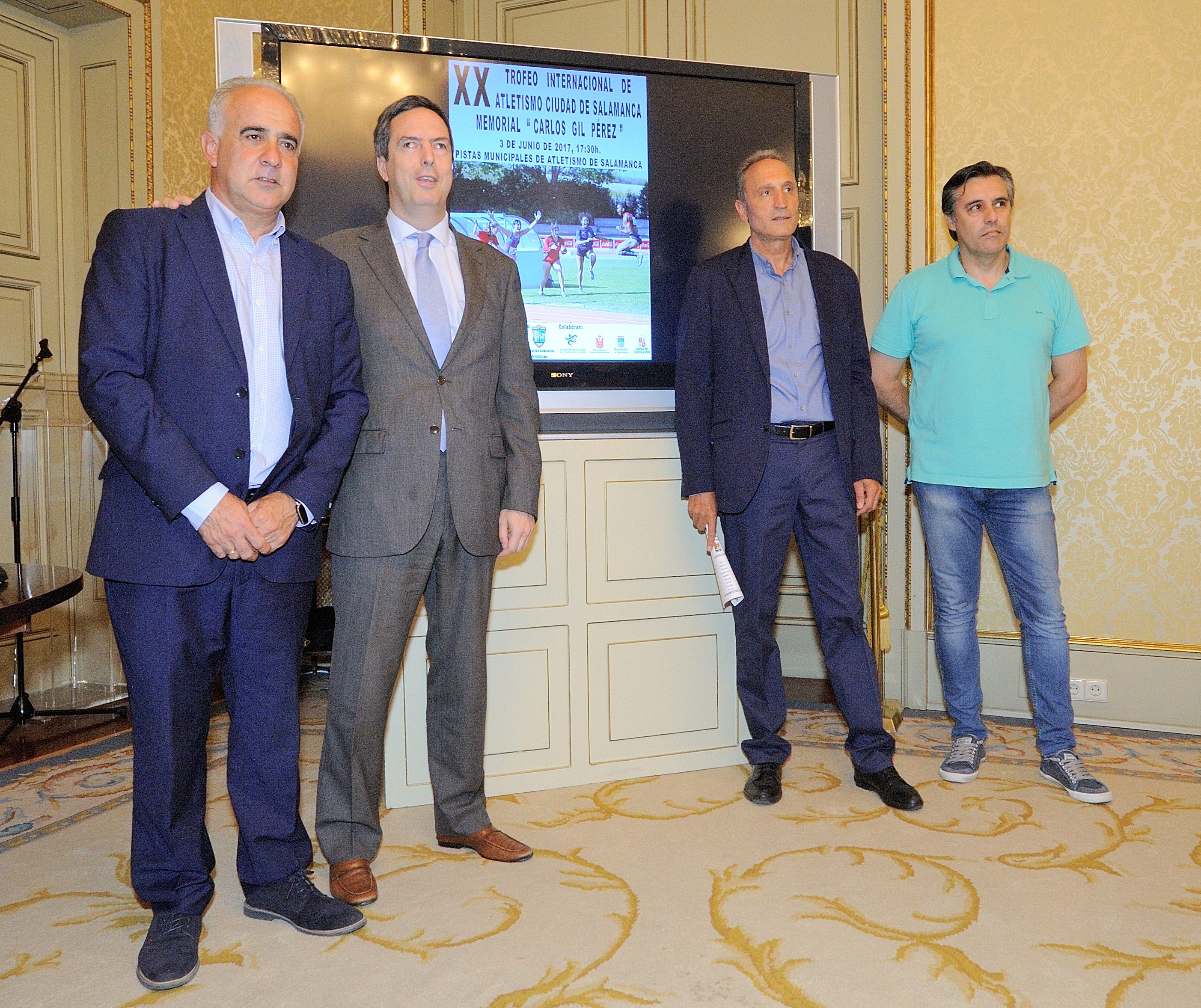 El concejal de Deportes, Enrique Sánchez-Guijo, ha presentado hoy junto al diputado provincial de Deportes, Jesús María Ortiz, el delegado provincial de Atletismo, Moisés Muñoz Macías, y el director técnico, Casimiro Blanco Sánchez, el XX Trofeo Internacional de Atletismo Ciudad de Salamanca Memorial “Carlos Gil Pérez”, una cita anual que reunirá este sábado a destacados velocistas y saltadores como Angel David Rodríguez, 100ml (Campeón de España PC); Yidiel Contreras, 110mv (semifinalista olímpico y finalista en el Campeonato de Europa); Sergio Fernández Roda, 400mv (Plata en Campeonato de Europa y Récord España); Eusebio Cáceres 100ml y Longitud; y en Salto de Longitud Femenino, Juliet Itoya, Cocha Montaner y Mª Mar Jover.