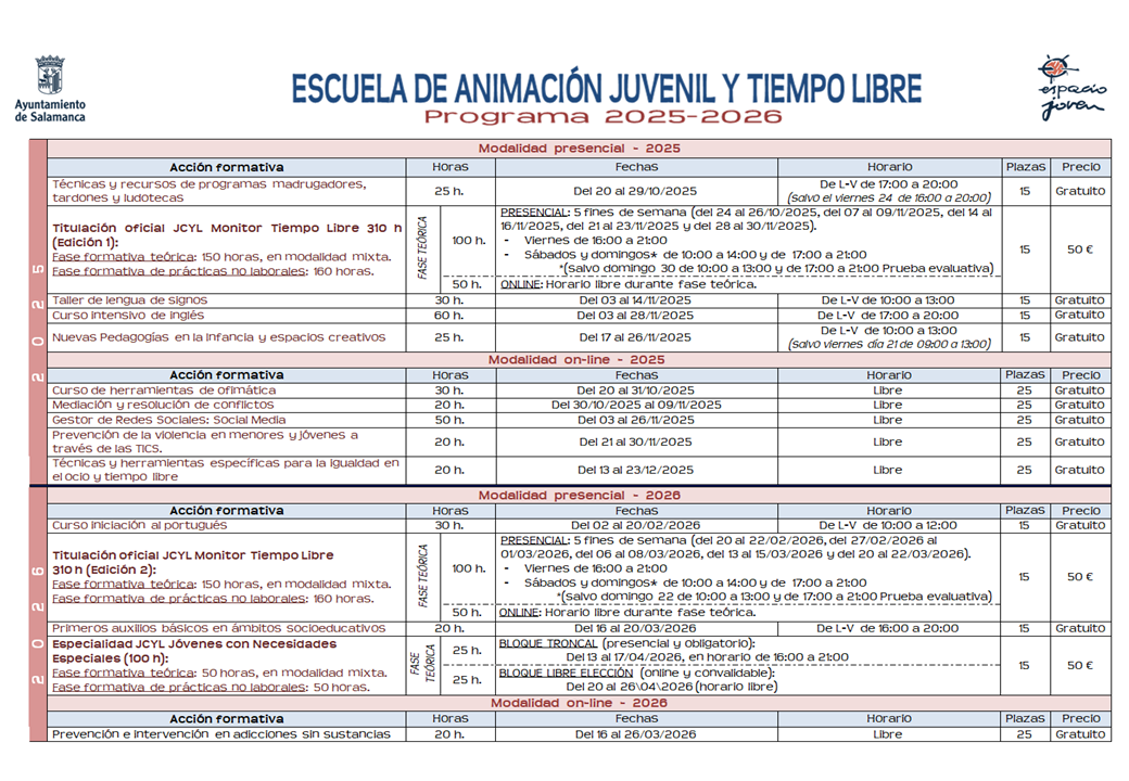 La Escuela de Animación Juvenil y Tiempo Libre del Ayuntamiento de Salamanca, ofrece acciones formativas destinadas a la población joven de la ciudad de Salamanca, dentro del ámbito de la educación no formal. Sus objetivos son:
