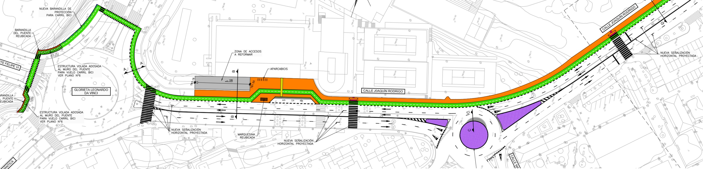Se pretende realizar unos vuelos en estructura metálica anclados al puente, de manera que el nuevo carril bici siga la ribera del río en dirección hacia Santa Marta de Tormes. Una vez superado el puente, cruzará la Vía Helmántica para desembocar en la calle Joaquín Rodrigo. Todo el carril bici circulará por el lado izquierdo de la vía existente en la actualidad, eliminándose la mediana central y trasladando los carriles de vehículos hacia el lado derecho de manera que sigan quedando los cuatro actuales, dos de ida y dos de vuelta.