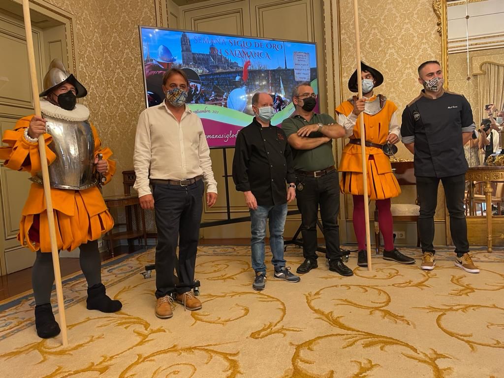El concejal de Turismo, Fernando Castaño; el productor cultural Manuel Sánchez Hoyos y Antonio Álvarez, de ‘La Cocina de Toño’, han presentado hoy los actos programados con motivo de la celebración de la Semana del Siglo de Oro en Salamanca, que tendrá lugar del 28 de agosto al 21 de septiembre.