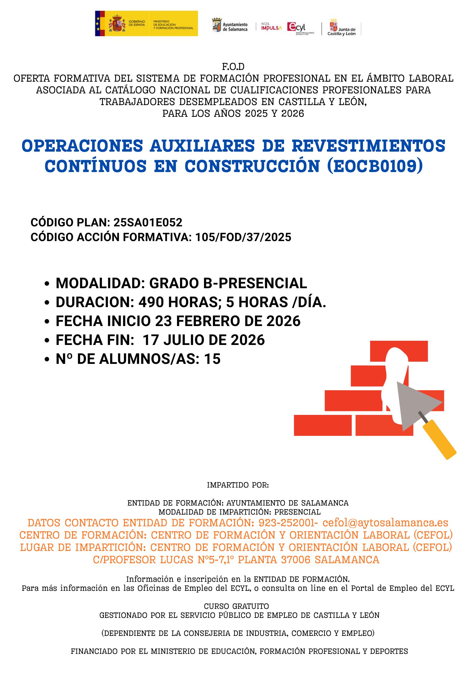 Dentro del sistema de formación profesional en el ámbito laboral asociada al catálogo nacional de cualificaciones profesionales para trabajadores desempleados en Castilla y León para los años 2025 y 2026, se le ha concedido al Ayuntamiento de Salamanca, la acción formativa vinculada a certificados de profesionalidad OPERACIONES AUXILIARES DE REVESTIMIENTOS CONTINUOS EN CONSTRUCCIÓN (EOCB0109) con las siguientes características: