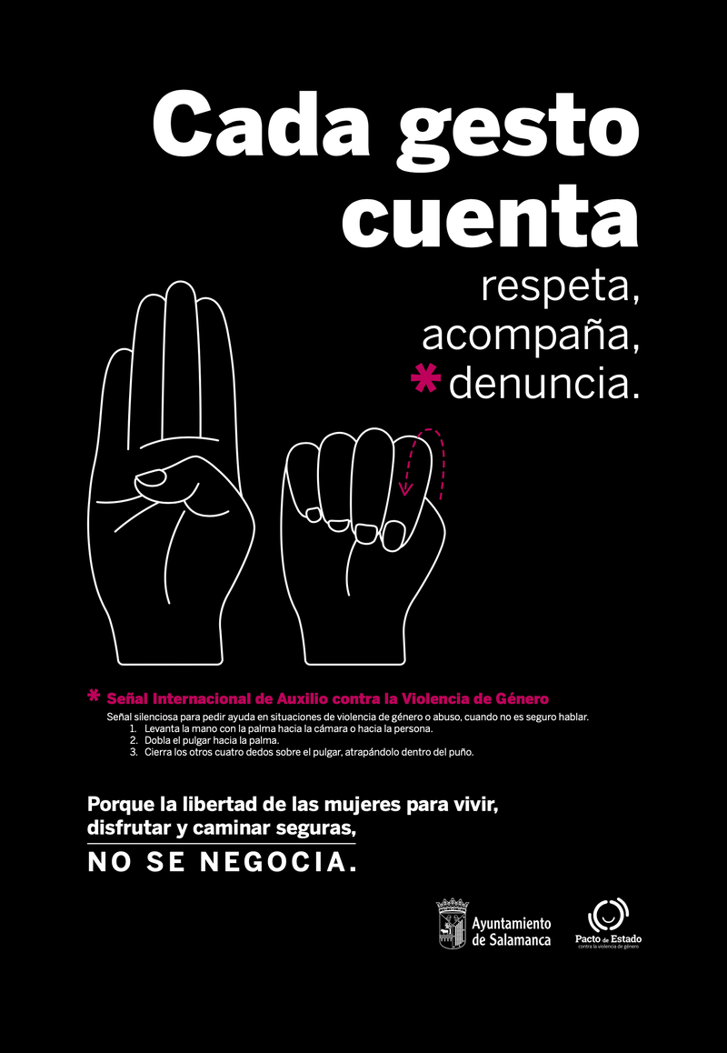 El Ayuntamiento de Salamanca ha puesto e en marcha una campaña de sensibilización y prevención de la violencia de género con motivo del Día Internacional de Eliminación de la Violencia contra la Mujer, que se conmemora cada 25 de noviembre. Bajo el lema principal ‘Cada gesto cuenta’ esta campaña tiene como principal objetivo hacer llegar el mensaje a la población de riesgo y educar a la población joven usuaria de las redes sociales, para transmitir con claridad y fuerza el rechazo a las agresiones sexuales y contra la violencia de género y así promover una cultura de respeto e igualdad.